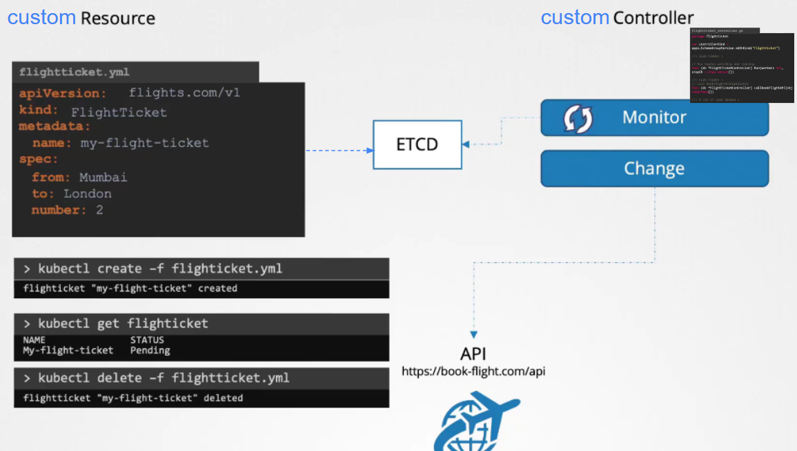 사용자가 Custom Resource를 생성하면, 해당 Custom Resource가 etcd에 저장되고, Custom Resource에 맞는 Custom Controller가 이를 Monitoring링하다가 Cluster의 상태를 Custom Resource에 정의된 것에 맞게 조정합니다.